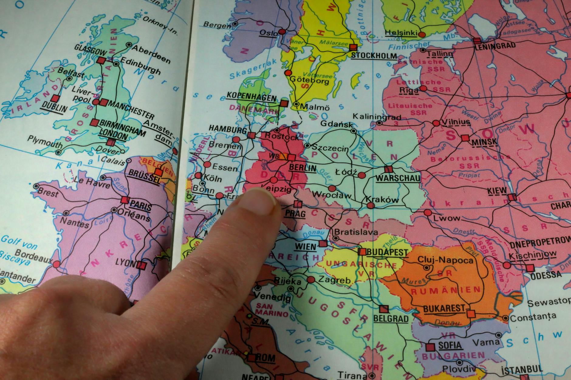 Zbliżenie na mapę Europy z widocznymi miastami Niemiec